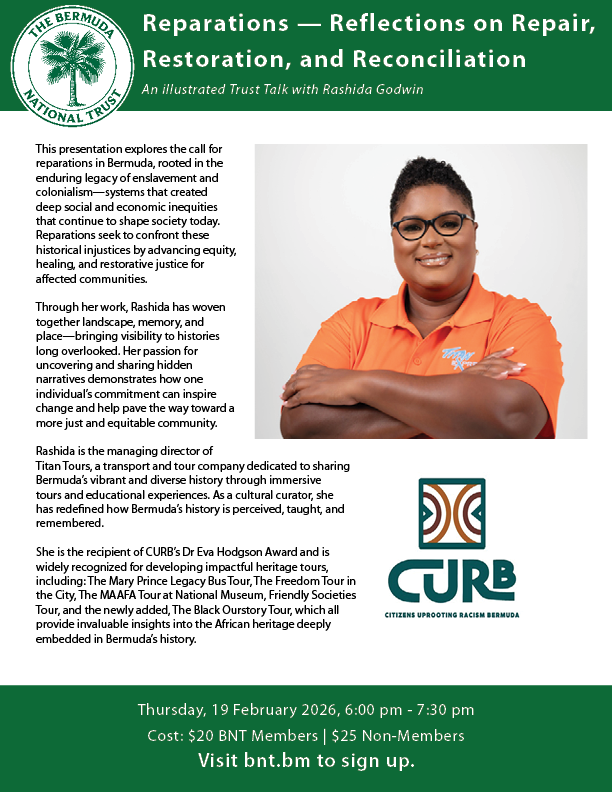 This presentation explores the call for reparations in Bermuda, rooted in the enduring legacy of enslavement and colonialism—systems that created deep social and economic inequities that continue to shape society today. Reparations seek to confront these historical injustices by advancing equity, healing, and restorative justice for affected communities.